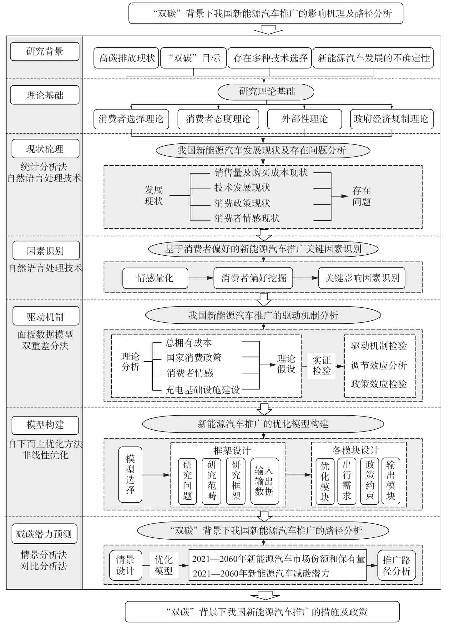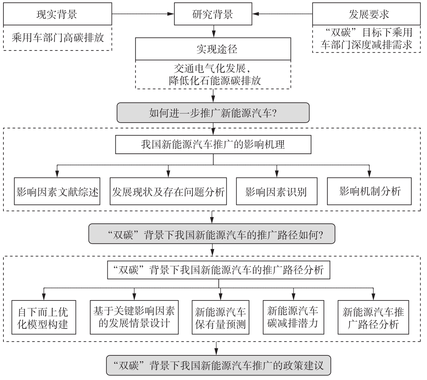 本书在“双碳”目标的发展背景下,以新能源乘用汽车为研究对象,以消费者为研究视角,对我国新能源汽车的相关发展现状进行梳理,在此基础上,挖掘影响消费者选择新能源汽车的关键因素,并分析各关键因素对新能源汽车推广的驱动机制。进一步,构建自下而上的能源系统优化模型,基于影响新能源汽车推广的关键因素设计新能源汽车未来发展的不同情景,分析不同情景下2021—2060年我国新能源汽车的市场份额及减碳潜力。最后,为进一步推动我国新能源汽车的发展,发挥新能源汽车的减碳潜力提出政策建议。本书的技术路线如图1-2所示。
