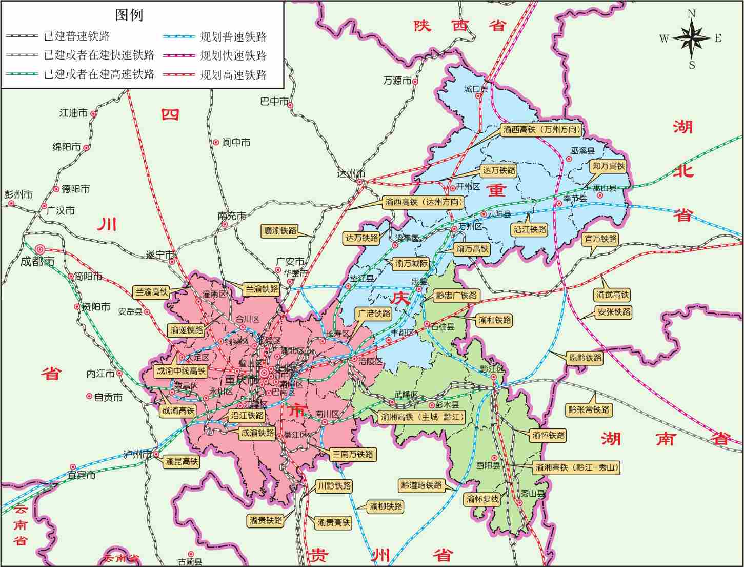 形成了“一枢纽十一干线”铁路网。目前,重庆拥有成渝高铁、渝万高铁、兰渝铁路、成遂渝铁路、渝利铁路、渝昆高铁、襄渝铁路、渝怀铁路、成渝铁路、渝贵铁路、川黔铁路11条干线铁路,形成联通全国乃至欧洲、东北亚、中亚、南亚、东南亚的国内国际铁路大通道(见图1-6)。2020年,重庆铁路营业里程2394千米,其中高铁里程896千米,占比37.4%。