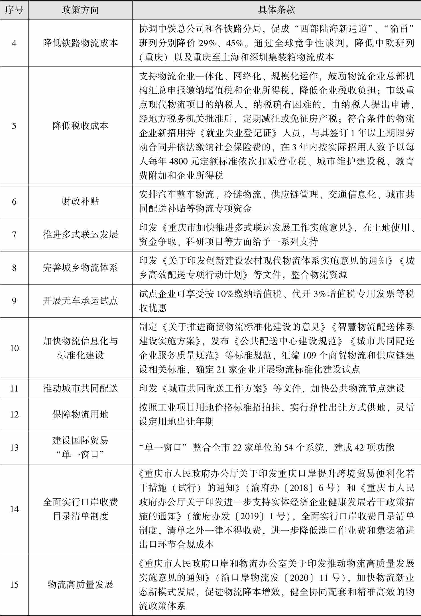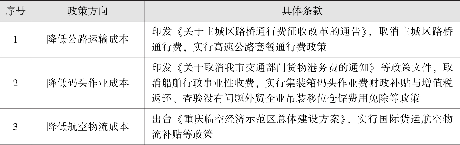 物流政策环境持续优化。近年来,重庆物流业政策体系不断完善,规划发展引领作用增强。相继出台《重庆市人民政府关于贯彻落实国家物流业发展中长期规划(2014—2020年)的实施意见》《重庆市人民政府办公厅关于印发重庆市促进物流业发展三年行动计划(2015—2017年)的通知》《重庆市人民政府办公厅关于印发重庆内陆国际物流分拨中心建设方案的通知》《重庆市人民政府口岸和物流办公室关于印发推动物流高质量发展实施意见的通知》等10余份政策文件,包括支持现代物流发展的土地、财政、税费、金融等具体政策。相关政策实施以来,累计为物流业减负超过100亿元。重庆市物流业政策措施见表1-1。