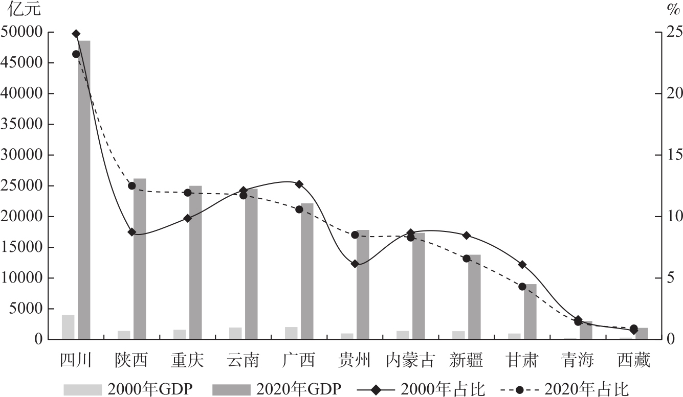 图1-2 2000年、2020年西部各省份GDP及占西部地区比重