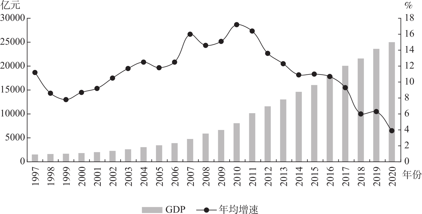 经济规模不断壮大。直辖以来,重庆经济持续快速增长,体量不断壮大。2020年,重庆地区生产总值(GDP)突破2.5万亿元,是1997年的16.4倍,年均增长12.9%;占西部地区比重由2000年的9.8%上升至2020年的11.9%(见图1-1、图1-2)。人均GDP突破8万元,居西部地区第一位。领军企业加速集聚,“世界500强”企业有296家入驻重庆,本土企业上榜2020年“中国企业500强”“服务业企业500强”数量分别达到15家、23家,居西部地区第一位。