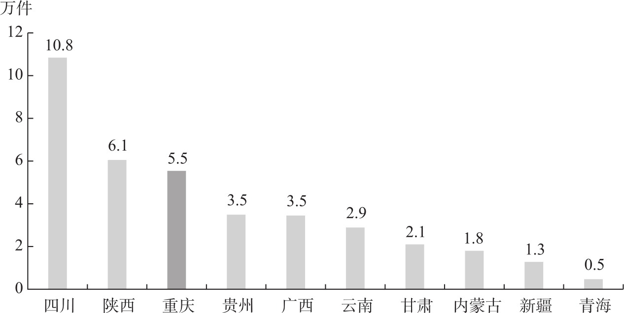创新引领潜力加速释放。近年来,重庆聚焦“智造重镇”“智慧名城”,深入实施以大数据智能化为引领的创新驱动发展战略,创新活力和创造潜能不断释放。2020年,重庆综合科技创新水平居全国第七位、西部第一位。创新投入持续提高。2020年,重庆R&D经费投入强度为2.1%,有研发机构的规模以上工业企业占比预计达到25%,规模以上工业企业研发投入占西部总量的26%以上,居全国第四位、西部第一位。万人发明专利拥有量达到11.3件,专利授权数居西部第三位。2020年西部各省份专利授权数见图1-3。创新平台加快建设。西部(重庆)科学城、两江协同创新区建设稳步推进,成功引进中科院大学重庆学院、中国工程科技发展战略重庆研究院、北京理工大学重庆创新中心、中电科联合微电子中心、英特尔FPGA中国创新中心等国内外知名高校院所和企业88家,累计建设新型研发机构142家、国家重点实验室10家。创新主体持续壮大。腾讯西南区域总部、科大讯飞西南总部等大数据智能化行业标杆企业纷纷入驻,拥有誉存科技、云从科技、猪八戒等多家“独角兽”企业。截至2020年底,高新技术企业、科技型企业数量分别达到4222家、26371家。
