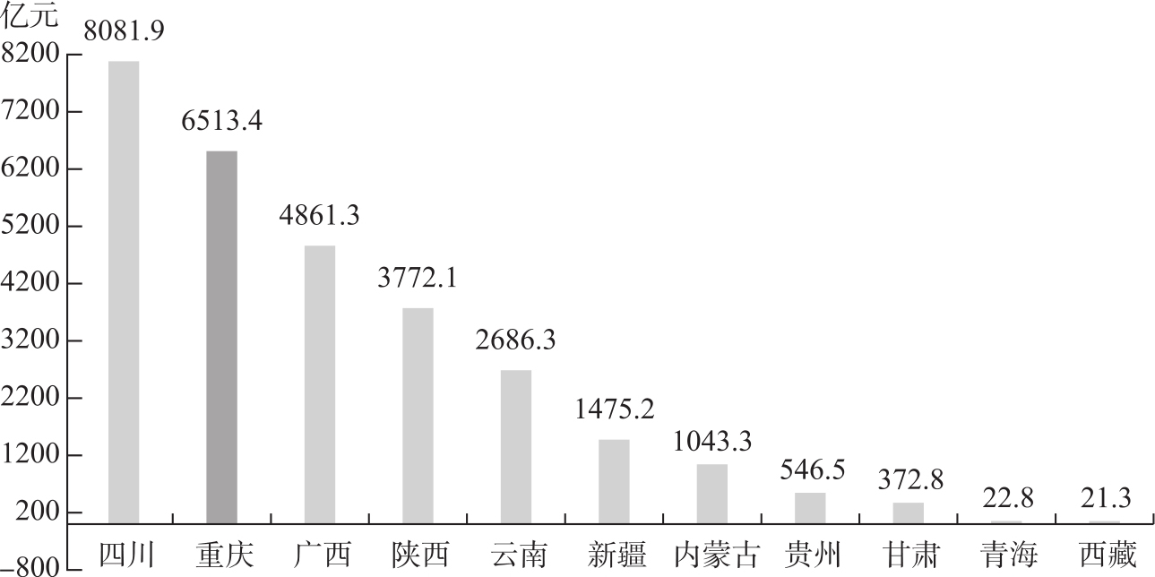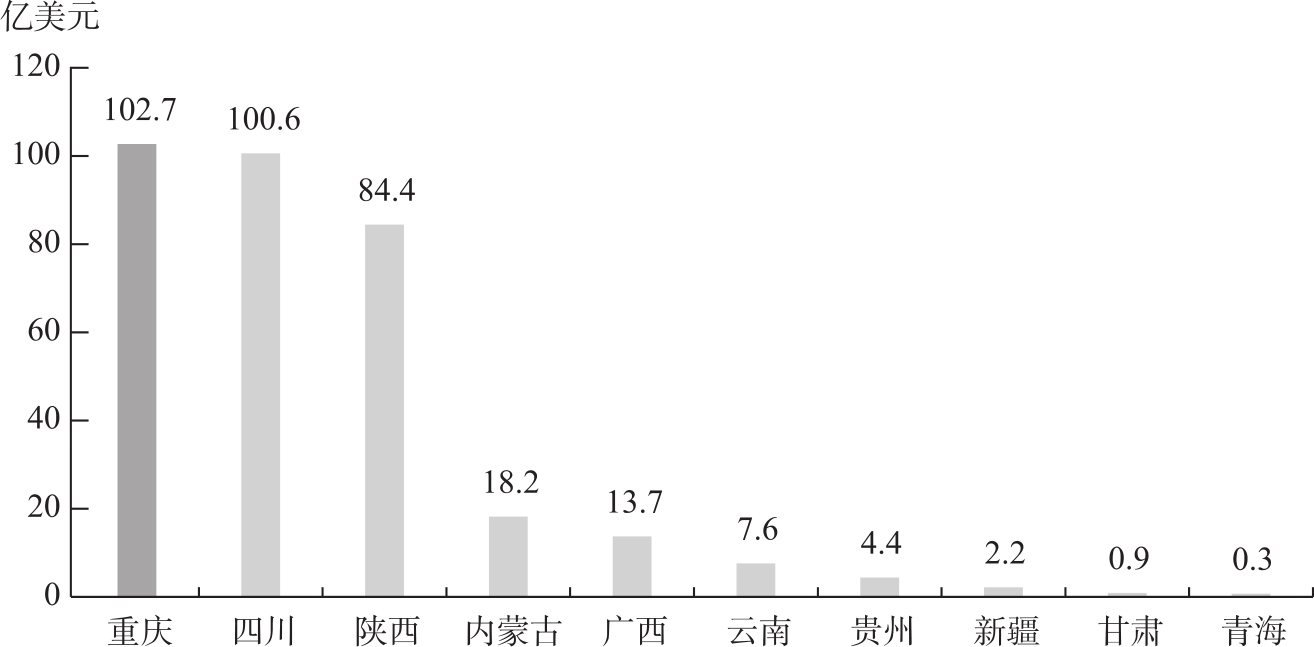 开放型经济发展成效显著。目前,重庆累计引进外商投资超过千亿美元,6000余家外商投资市场主体贡献了全市50%以上的进出口总额,已经成为重庆对外开放的“主力军”。截至2020年底,“世界500强”企业已落户296家,居西部第二位。2020年,实现货物进出口总额6513.4亿元,占西部地区货物进出口总额的22.2%,居西部第二位。其中,重庆对东盟、美国、欧盟三大贸易伙伴分别进出口1121.7亿元、1076.5亿元、1037.8亿元,占重庆总额比重分别为17.2%、16.53%、15.9%。2020年西部各省份进出口总额和实际利用外资额见图1-4、图1-5。