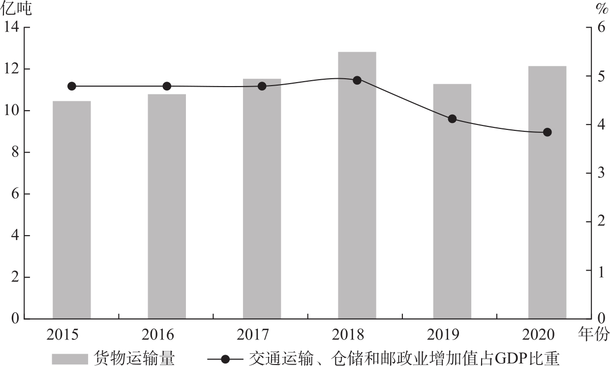 物流业不断提质增效。在开放型经济发展及物流大通道、大枢纽、大口岸加快带动下,重庆物流业发展进一步加快,发展环境不断优化。物流费用持续下降。2015—2020年,重庆货物运输量由10.46亿吨升至12.14亿吨,而交通运输、仓储和邮政业增加值占GDP比重由4.8%降至3.8%(见图1-8)。物流运输结构持续优化。2020年,重庆公路货运量9.97亿吨,占总货运量比重为82.1%,较2015年下降了1.4个百分点;水路货运量2.1亿吨,占总货运量比重为16.3%,较2015年上升了1.6个百分点。在西部陆海新通道、中欧班列(渝新欧)的带动下,铁路货运量快速增长。2020年,重庆铁路运输量1878.45万吨,其中铁路国际标准集装箱吞吐量31.76万标准箱,同比增长31.2%。物流企业快速发展集聚。目前重庆交通运输企业11.2万户,车辆规模在100台以上企业500多户,营业收入百亿级、十亿级和亿级物流企业分别达到1家、11家和70家,并引进了美国安博、意大利维龙等一批“世界50强”物流企业。