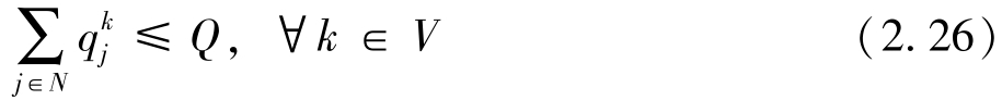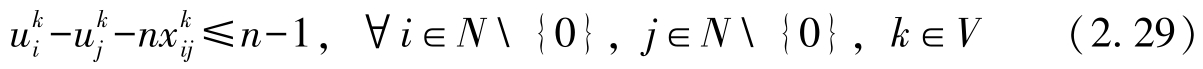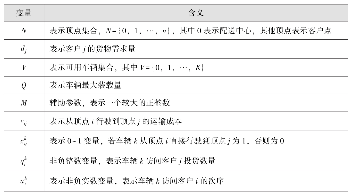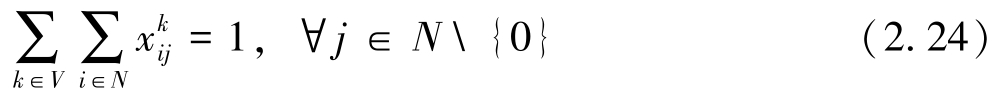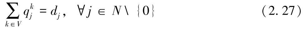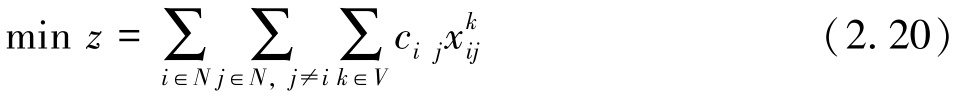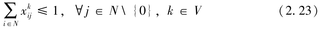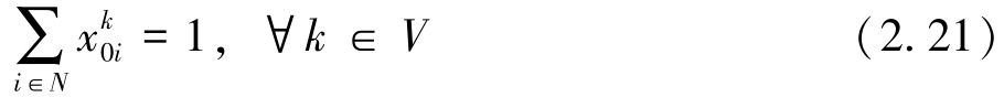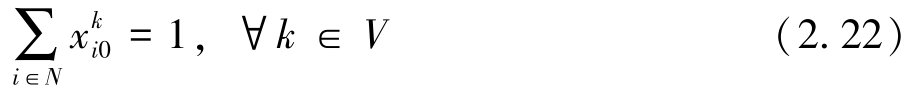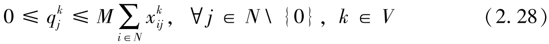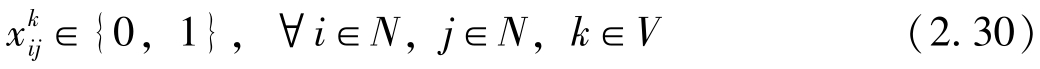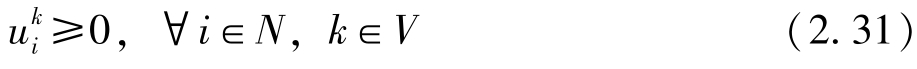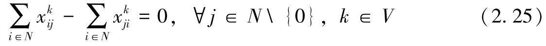 式(2.20)表示目标函数,最小化运输成本。式(2.21)和式(2.22)表示派出车辆从配送中心出发,完成任务后返回配送中心。式(2.23)表示每个客户点被每辆车最多访问一次。式(2.24)表示每个客户点被所有车辆有且仅被访问一次。式(2.25)表示车辆流平衡约束。式(2.26)表示车辆访问所有客户的装载量不能超过其最大允许装载量。式(2.27)表示每个客户的投货需求得到充分满足。式(2.28)表示投放量决策和路径决策之间的关系。式(2.29)表示子回路消除约束。式(2.30)表示0~1路径决策变量。式(2.31)表示客户访问次数决策变量。