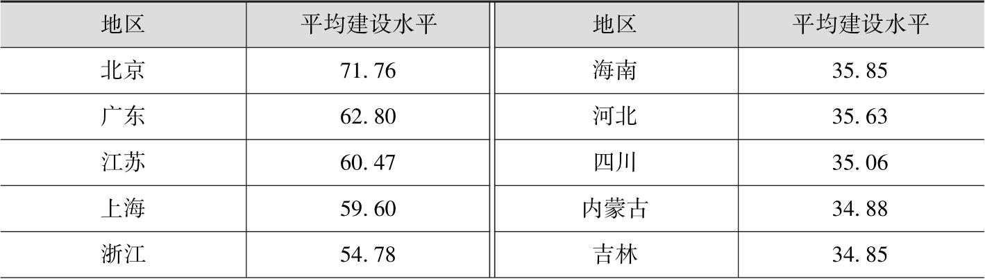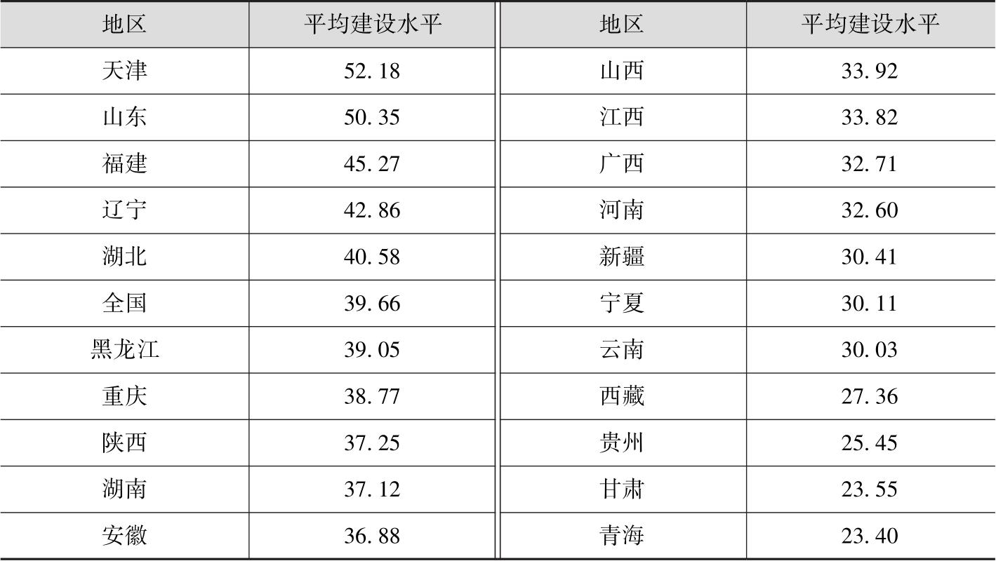 计算2003—2017年各地区生态文明建设水平,发现北京作为我国首都,生态文明建设水平达到71.76%,领先全国其他地区;广东、江苏、上海三地生态文明建设水平处于全国较高水平,分别达到62.80%、60.47%以及59.60%;西藏、贵州、甘肃、青海等地生态文明建设水平均未超过30%,处于全国最低水平。2003—2017年,全国平均生态文明建设水平为39.66%,我国31个地区中仅有10个地区生态文明建设水平超过全国平均水平,其中有9个地区属于东部地区,还有1个——湖北位于长江经济带流域的中部地区。生态文明建设水平处于全国后10位的地区包含8个西部地区,2个中部地区。西部地区包括青海、甘肃、贵州等地;2个中部地区分别是江西、河南,其生态文明建设水平分别为33.82%、32.60%。2003—2017年,全国及各地区生态文明平均建设水平情况,如表3.3所示。