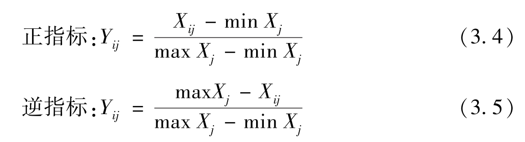 由于选取的指标不仅包含正指标,还包含负指标,因此采用Min-max标准化法对平稳化后的数据进行标准化处理。其计算公式为: