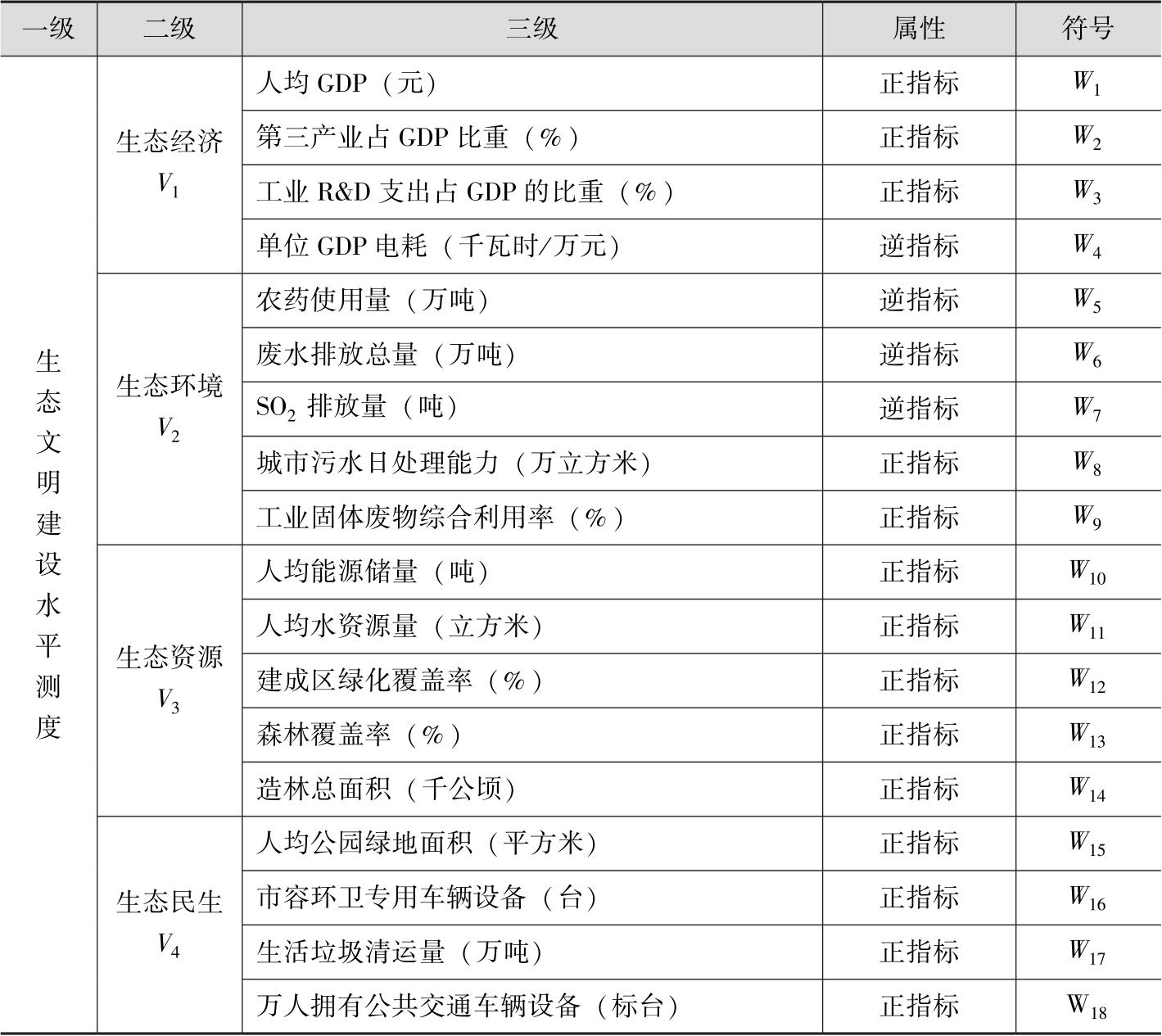 本书在参考国内外相关研究成果基础上,从指标体系构建原则出发,将生态文明建设水平测度作为一级指标层,生态经济、生态环境、生态资源以及生态民生作为二级指标层,各二级指标层分别选取4~5个具有代表性的三级指标,构成我国生态文明建设水平测度指标体系,如表3.1所示。