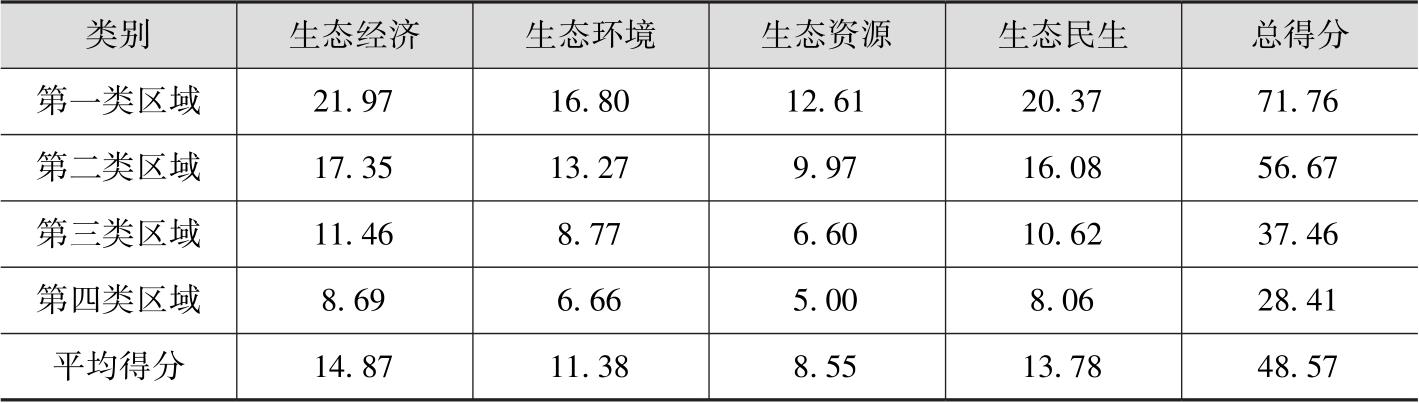 分析各区域在生态经济、生态环境、生态资源以及生态民生的得分情况,发现4类区域在生态经济与生态民生层面的建设情况优于生态环境以及生态资源层面的建设情况。其中,生态经济与生态民生的平均得分分别为14.87分、13.78分,分别占总得分的30.62%和28.37%;生态环境、生态资源得分情况占总得分的23.42%与17.59%。2003—2017年我国各类区域生态文明建设水平二级指标层的得分情况如表3.6所示。