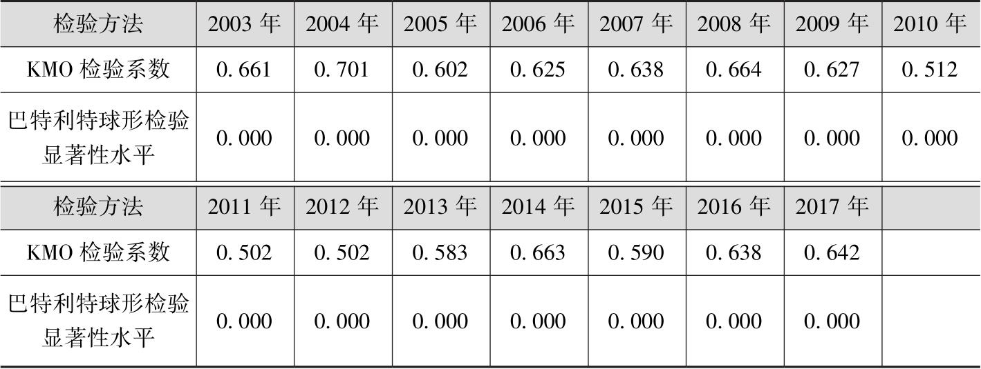 表3.2 2003—2017年KMO检验与Bartlett检验