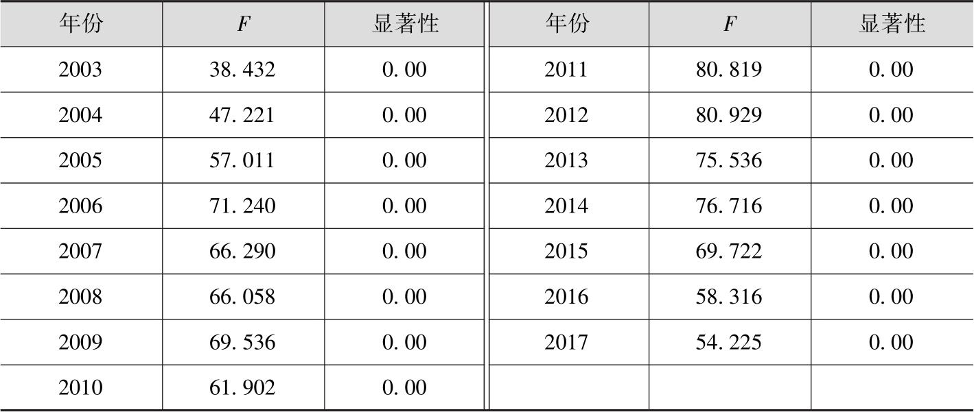 表3.4 2003—2017年我国各地区生态文明建设水平分类显著性水平