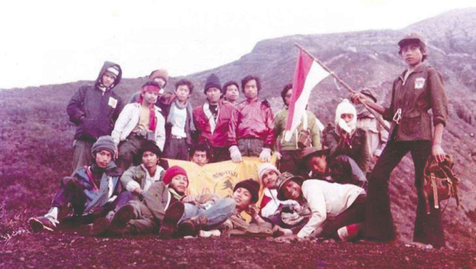 佐科·维多多和他在加查马达大学林业系自然爱好者协会的朋友们在一次登山活动时的留影。摄影:伊斯特瓦工作室。