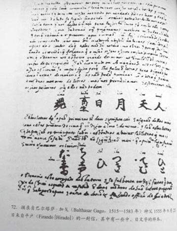 摘录自巴尔塔萨·加戈神父1555年9月23日来自平户的一封信中有一些中、日文字的样本。加戈1555年的信,1565年第一次在科英布拉刊印的《信札复本》( Copia de las Cartas )中,并在后来的其他几个文集中被刊印。图1、图2出自《来自日本和中国的信札》(埃武拉,1598)。