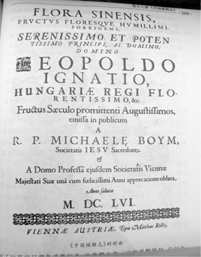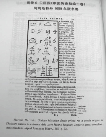 继卜弥格的《中国植物志》之后,在欧洲正式出版物上呈现汉字的就是卫匡国1659年出版的《中国上古史》(Mattino Martinio, Sinicae historiae decas prima res a gentis origine ad Christum natum in extrema Asia, sive Magno Sinarum Imperio gestas complexa. Amstelaedami:Apud Joannem Blaev, 1659)。