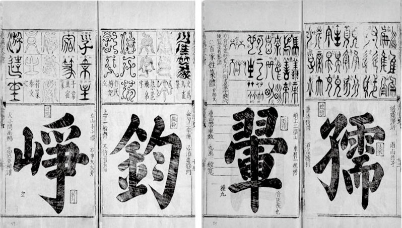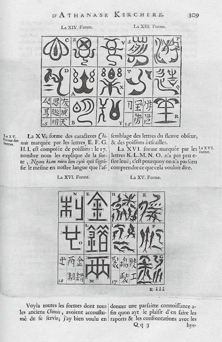 “第一个在欧洲介绍中国书写文字的就是基歇尔。” [42] 在《中国图说》中他介绍了中国的16种古代文字,分别是:伏羲氏龙书(Fòhi xi lùm xù)、穗书神农作(Chum xu xim NûmÇo)、凤书少昊作(Fum Xùxan hoamÇo)、蝌蚪颛顼作(Li teùchuen kimÇo)、庆云黄帝篆(Kim yun hoam ty chuen)、仓颉鸟迹字(Choam ham miào cye chi)、尧因龟出作(Yao yn queyÇo)、史为鸟雀篆(Su guey nia cyòchuen)、蔡邕飞帛字(Cha yèfi mienÇo)、作氏笏记文(Ço xi’ho ki ven)、子韦星宿篆(Çu guey sym so chuen)、符篆秦文之(Fu chuen tay venchi)、游造至剪刀(YeuÇau chi eyen tao)、安乐知思幽明心为(Ngan lochi su yeu min sym quei)、暖江锦鳞聚(Ngum kiam mien lien cyeù)、金错两制也。 [43]