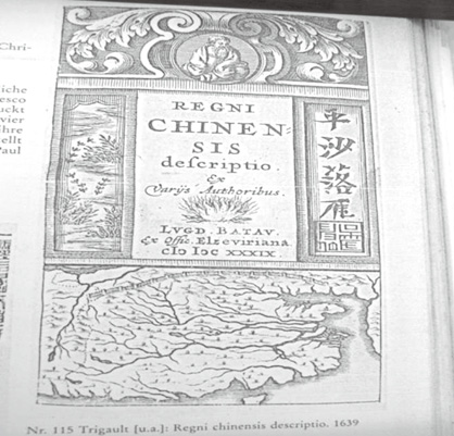 进入17世纪后,在欧洲出版物中首先出现汉字的书籍是金尼阁(Nicolas Trigault,1577—1629)翻译的利玛窦的《基督教进入中国史》,金尼阁在返回欧洲的旅途中将利玛窦的意大利手稿翻译为拉丁文,并补写了利玛窦去世后的几章。1615年这本书在欧洲出版后引起了巨大的反响。“除了对汉学家和中国史的研究者而外,金尼阁的书比较不大为人所知,然而它对欧洲的文学和科学,哲学和宗教等生活方面的影响,可能超过任何其他十七世纪的历史著述。它把孔夫子介绍给欧洲,把哥白尼和欧几里得介绍给中国。它开启了一个新世界,显示了一个新的民族……” [23] 《基督教进入中国史》的英文译者在“序言”中认为,这本书在1615年拉丁文首版后,先后又出版了1616年、1617年、1623年和1648年四种拉丁文版。同时还有三种法文版,先后刊行于1616年、1617年、1618年。1617年出了德文版。1621年同时出版了西班牙文版和意大利文版。 [24] 但笔者发现英文版译者没有注意到1623年的拉丁文版的学术意义在于这一版的封面上出现了四个汉字“平沙落雁”,这是17世纪在欧洲出版史上首次出现汉字。