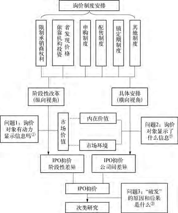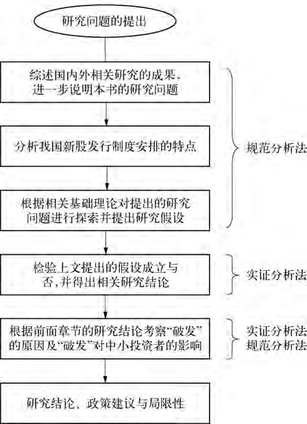 本书的研究围绕前面提出的问题,遵从“提出问题—分析问题—解决问题”的逻辑线索展开。首先回顾与本书研究问题有关的国内外研究成果,在文献梳理的基础上对我国新股发行制度进行了介绍和分析;其次通过理论分析,提出研究假设,并根据公开披露数据采用实证研究方法验证提出的假设;然后在前文研究的基础上进一步深化,分析IPO“破发”的原因和后果;最后对本书的研究发现进行归纳总结,提出相关政策建议,并指出本研究存在的不足,以及未来需要解决的问题。
