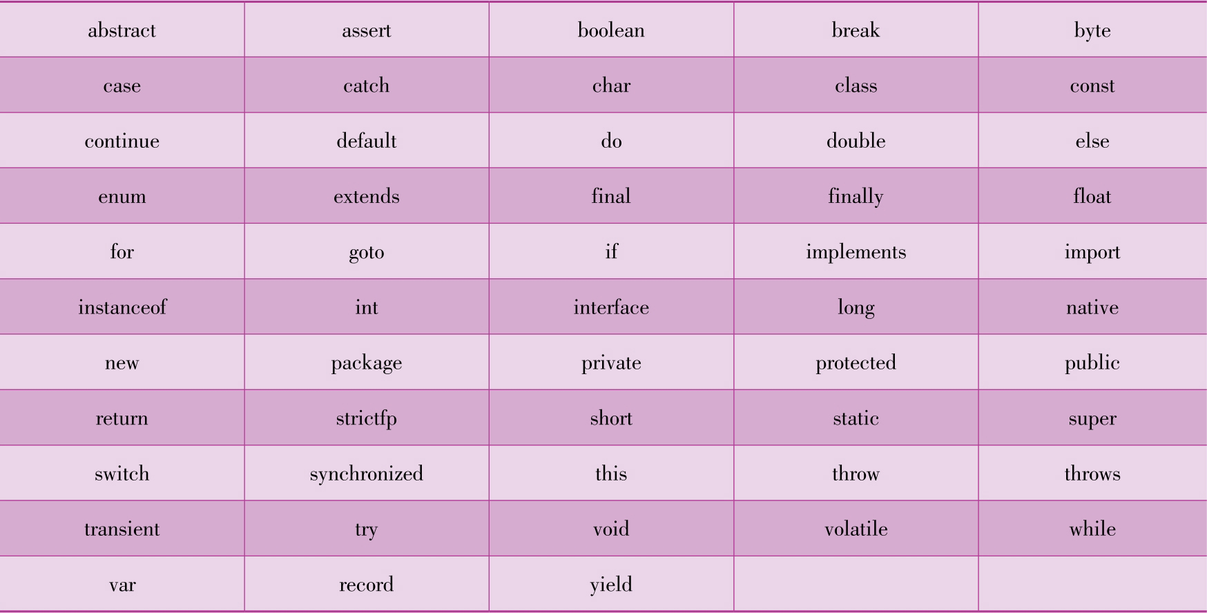 在Java编程中,关键字是具有特殊含义和功能的保留单词,用于表示特定的语法结构和操作。这些关键字在编程语言中已经预留,并且不能用作标识符。截止到Java 21,Java语言中有50多个关键字,如表2-1所示。