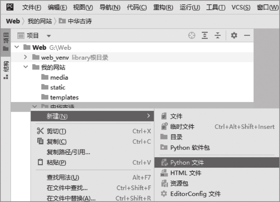 除了自动创建的模块文件,我们还可以根据需求为当前应用添加“urls.py”模块。如图3-14所示,在Pycharm中,通过在Web应用目录上单击鼠标右键,菜单中选择新建(N)→Python文件(Python File),输入文件名称后,就能够完成Python文件的创建。