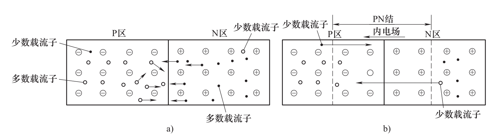 a)多数载流子的扩散运动 b)PN结中的内电场与少数载流子的漂移运动