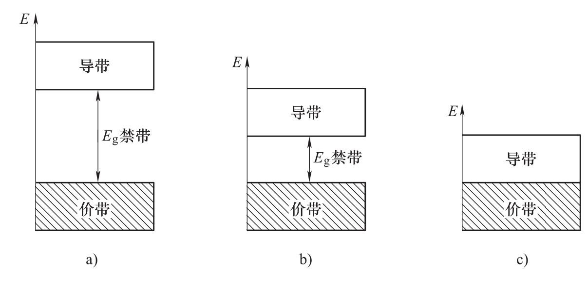 a)绝缘体禁带非常宽 b)半导体禁带较窄 c)导体无禁带