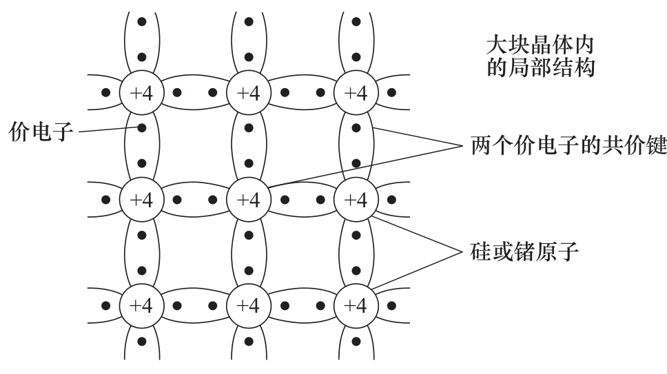 在电子元器件中,使用最多的材料是硅和锗,硅和锗都是4价元素,其原子的最外层有4个电子,称为价电子。每个原子的4个价电子不仅受自身原子核的束缚,而且会分别与周围相邻的4个原子发生联系:它们一方面围绕自身的原子核运动,另一方面也时常出现在相邻原子的最外层电子轨道上。这样,相邻的原子就被共有的价电子联系在一起,称为共价键结构,如图1-1所示。