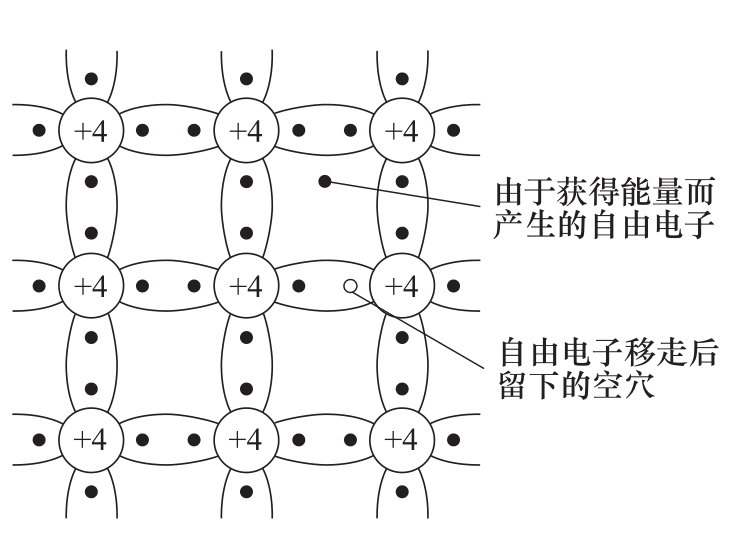 纯净的半导体称为本征半导体。在温度为0K(相当于-273.15℃)时,每一个原子的价电子均被共价键所束缚,不能自由移动。这样,本征半导体中虽有大量的价电子,但没有自由电子,此时半导体是不导电的。在温度升高或受到光辐射时,半导体共价键中的价电子并不像绝缘体共价键中的价电子那样依然无法自由移动,当半导体的价电子从外界获得一定的能量后,其中少数价电子便可挣脱共价键的束缚成为自由电子,并在共价键中留下一个空位,称为空穴,如图1-2所示。此时原子因失掉价电子成为阳离子而带正电,或者也可以说空穴带正电。如果有一个自由电子从共价键中释放出来,就必定留下一个空穴。所以本征半导体中自由电子和空穴总是成对地出现,称为电子-空穴对。