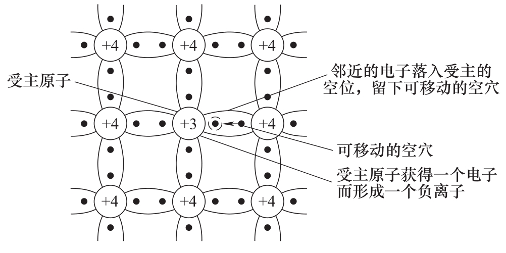 在本征半导体中,自由电子与空穴是同时产生且数目相等的。自由电子在运动过程中若与空穴相遇,则会填补空穴,此时一个电子-空穴对即消失,这个过程叫作复合。在一定条件下,本征半导体中同一时刻产生的电子-空穴对和复合的电子-空穴对数量相等,达到动态平衡,而电子-空穴对也由此维持一定的数目。