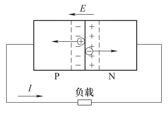 PN结光生伏特效应的示意图如图1-7所示,当电子-空穴对在空间电荷区产生后,立即被内电场分离,自由电子被推向N区,空穴被推向P区。在N区中的电子-空穴对向PN结扩散时,一旦达到空间电荷区的边界,就立即受到内电场的作用,空穴被推入P区,而自由电子则被留在N区。P区中的自由电子则同样先扩散,后在内电场的作用下被推入N区,而空穴则留在P区。因此,在P区出现了过剩的空穴,在N区出现了过剩的自由电子,如此便在PN结两侧形成了正负电荷的积累,产生与内电场方向相反的光生电动势,也就是光生伏特效应。将半导体做成太阳能电池并外接负载后,光电流从P区经负载流至N区,负载即得到功率输出,太阳能便转换成电能。