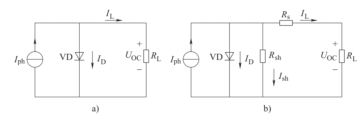 R s 和 R sh 均为硅太阳能电池本身的固有电阻,相当于电池的内阻。一个理想的太阳能电池,因为串联的 R s 很小、并联的 R sh 很大,所以进行理想电路计算时,可将二者忽略不计而作为理想的太阳能电池看待,其等效电路只相当于一个电流为 I ph 的恒流源与一个二极管并联,如图1-8a所示。此外,硅太阳能电池等效电路理论上还应包含由PN结形成的结电容和其他分布电容,但由于太阳能电池是直流设备,没有高频交流分量,因此可将这些电容忽略不计。
