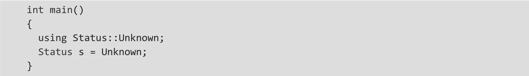 using指令的作用是将所有标识符引入局部作用域,这样就可以在不用限定名称的情况下引用它们了。也可以使用using指令将具体的枚举器引入局部作用域,例如using Status::Connected。