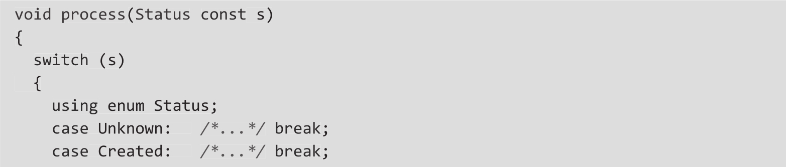 ❍ 在switch语句中,使用using enum指令引入作用域枚举标识符可以简化代码: