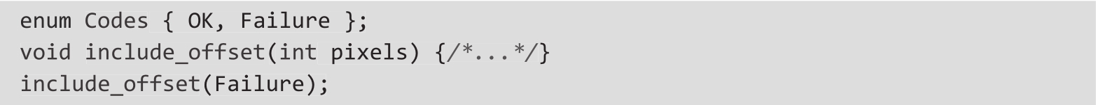 ❍ 枚举器的值会隐式转换为int。这意味着你可以有意或者无意地将有特定含义的枚举和整数混用(这甚至与枚举的含义无关),而且编译器不会发出警告。