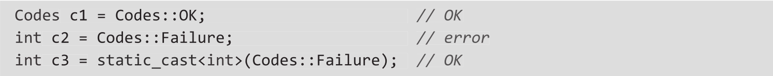 ❍ 在作用域枚举中,枚举器的值不再隐式地转换为int。除非指定了显式转换,否则将enum class的值赋给整数变量会导致编译错误:
