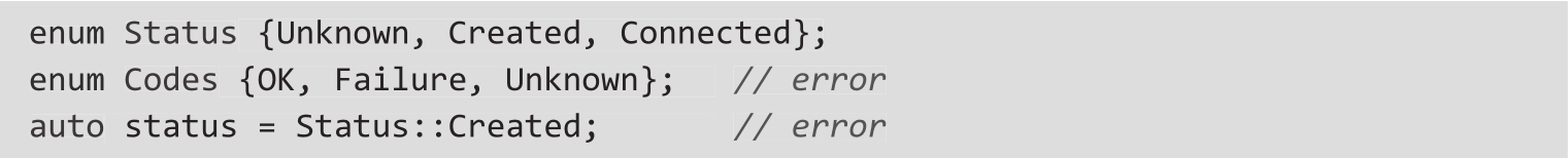 ❍ 它们把枚举器导出到周围的作用域(基于此,它们被称为无作用域枚举),所以就有以下两个缺陷。