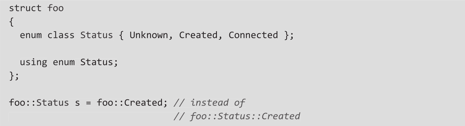 因为作用域枚举是受限制的命名空间,所以C++20标准允许我们将它们与using指令结合使用。你可以执行以下操作: