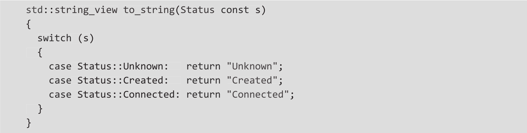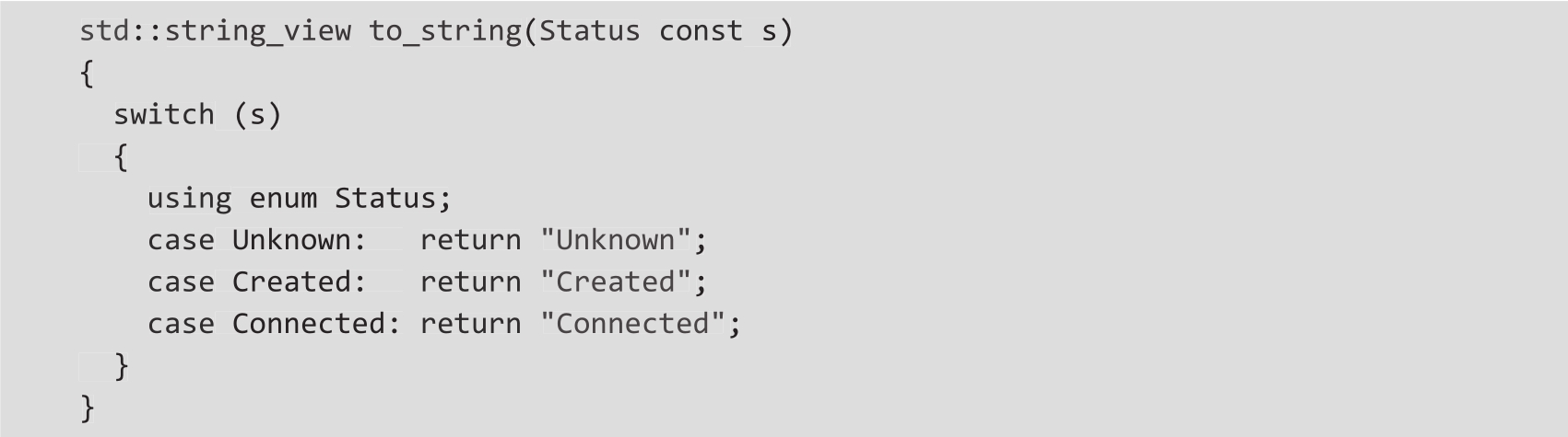 在C++20中,这可以通过使用具有作用域枚举名称的using指令来简化。上述代码可以简化为如下代码: