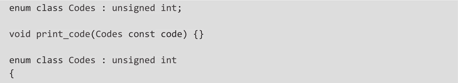 ❍ 可以指定基础类型。除了作用域枚举可以指定基础类型之外,无作用域枚举中基础类型的规则同样适用于作用域枚举。这也解决了前置声明的问题,因为在定义可用之前就已经知道基础类型了: