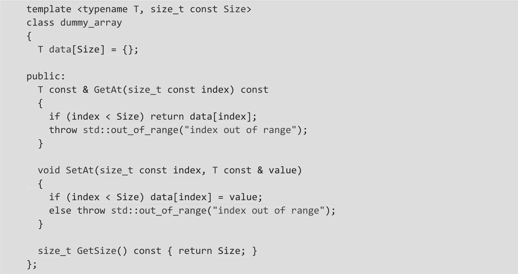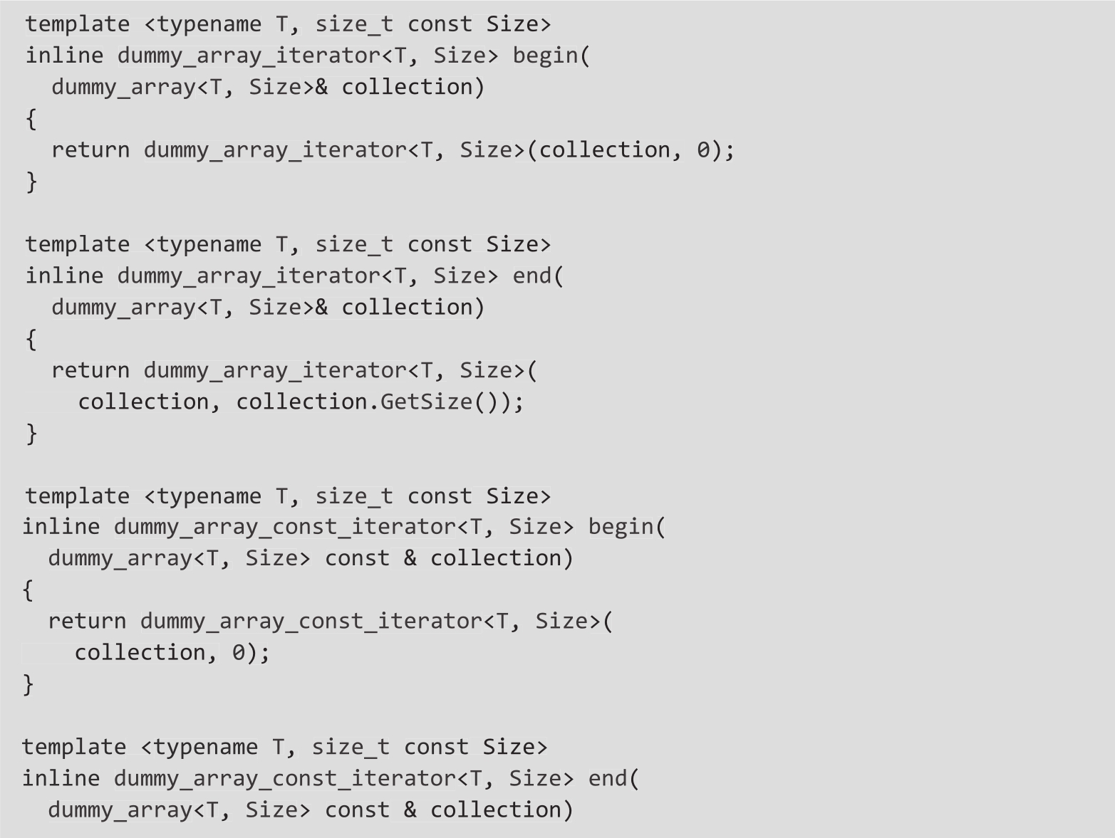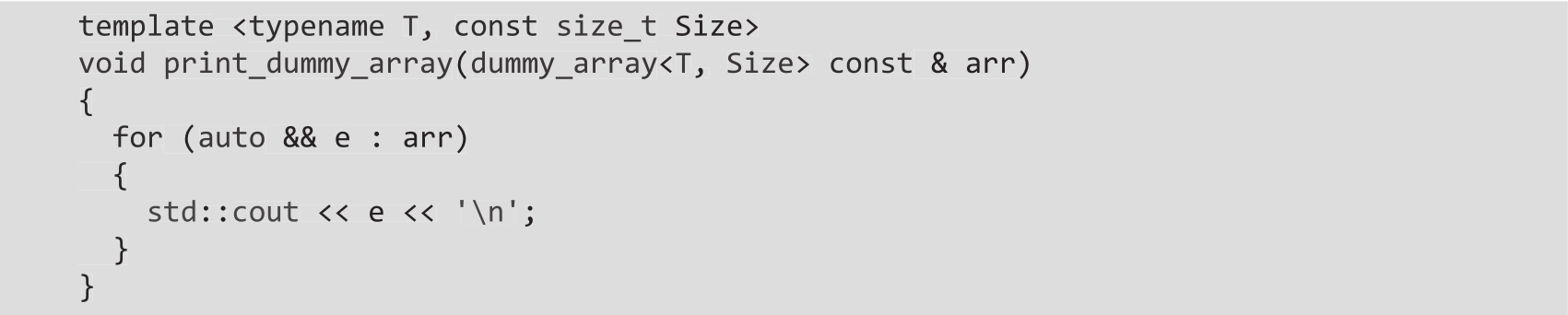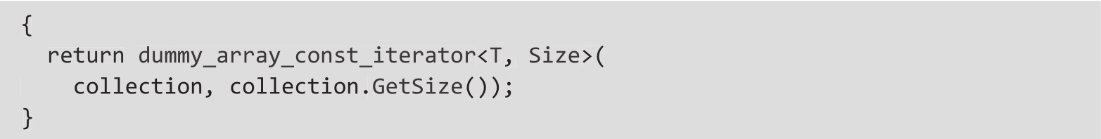 有了这样的实现,前面显示的基于range的for循环将按预期编译和执行。在执行参数依赖查找时,编译器将识别我们编写的两个函数begin()和end()(它们接受dummy_array的引用),因此它生成的代码是有效的。