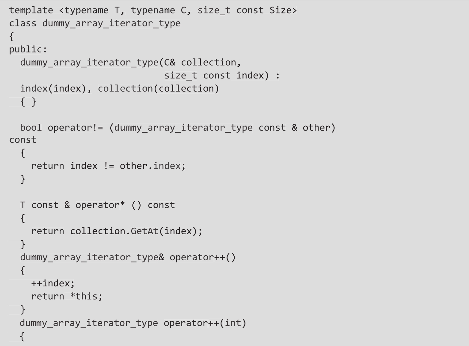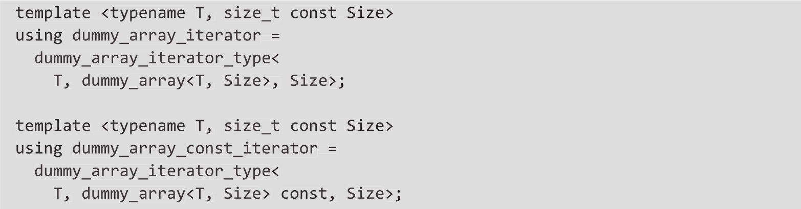在前面的例子中,我们定义了一个迭代器类模板和两个模板别名,分别称为dummy_array_iterator和dummy_array_const_iterator。对于这两种类型的迭代器,begin()和end()函数都有重载。