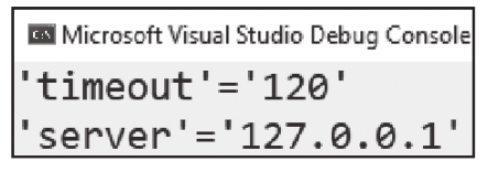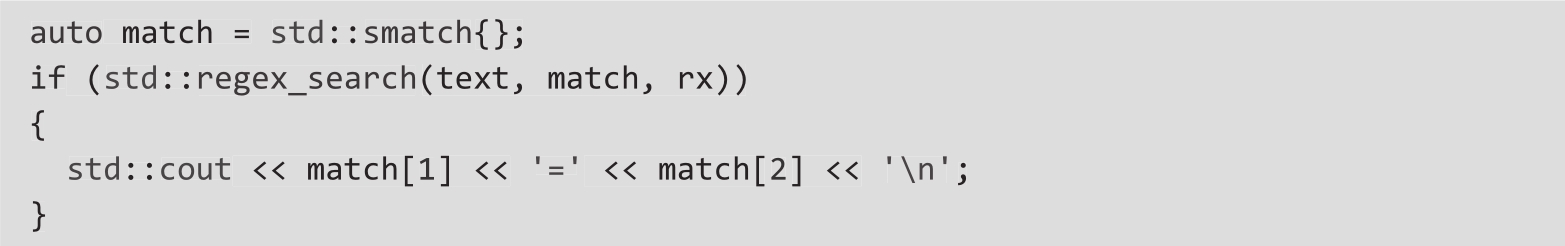 在上一节的示例1中(参见第4行),match是std::smatch(std::match_results的别名)的一个实例,它以string::const_iterator作为模板类型。如果找到匹配项,该对象以序列的形式包含所有匹配子表达式的匹配信息。索引0处的子匹配项始终匹配整个字符串;索引1处的子匹配项是该序列匹配的第一个子表达式;索引2处的子匹配项是该序列匹配的第二个子表达式,以此类推。因为正则表达式中有两个捕获组(它们是子表达式),如果匹配成功,std::match_results将有3个子匹配项。表示名称的标识符的索引为1,等号后面的值的索引为2。因此,这段代码只打印图2.4所示的内容。