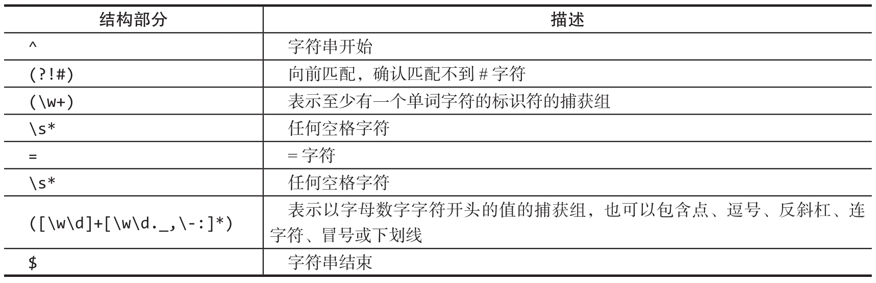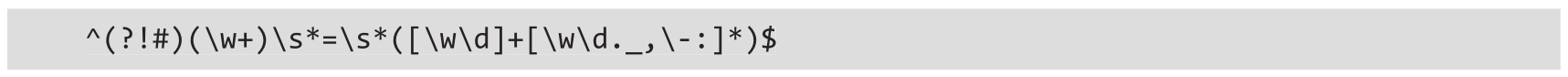 这个正则表达式应该忽略所有以#开头的行,对于那些不以#开头的,需要匹配名称和名称后面的等号,以及一个可以由字母数字字符和其他字符(如下划线、点、逗号等)组成的值。该正则表达式的确切描述如表2.3所示。