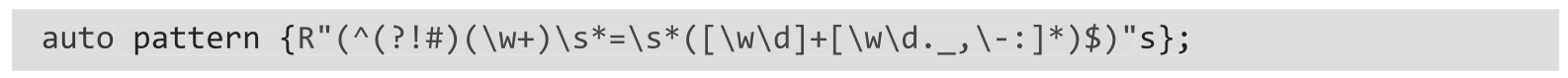 ❍ 使用原始字符串字面量来指定正则表达式,以避免转义反斜杠(因为这可能时常发生)。以下正则表达式可验证前面提到的文件格式:
