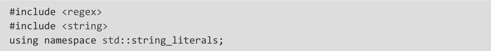 ❍ 包含头文件<regex>和<string>以及命名空间std::string_literals(C++14标准字符串可以使用的用户自定义字面量):