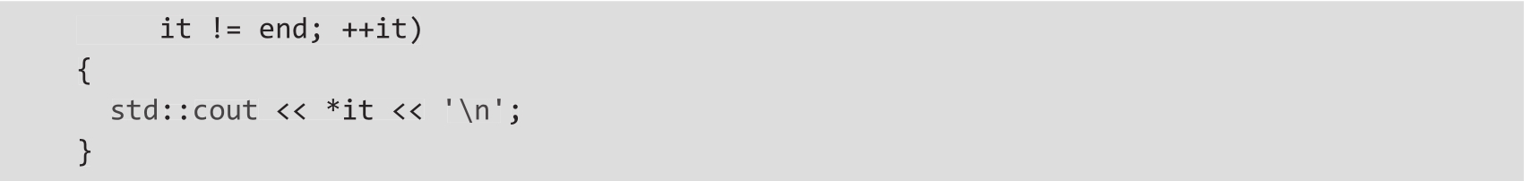 在上一节的示例2中(参见列表的第5项),我们首先创建一个序列end迭代器,然后开始遍历所有可能的匹配项。当它被构造时,它将调用std::regex_match(),如果找到了匹配项,就可以通过当前迭代器访问其结果。此过程一直继续下去,直到找不到匹配项(即到达序列结尾)。这段代码将会打印图2.5所示的输出结果。