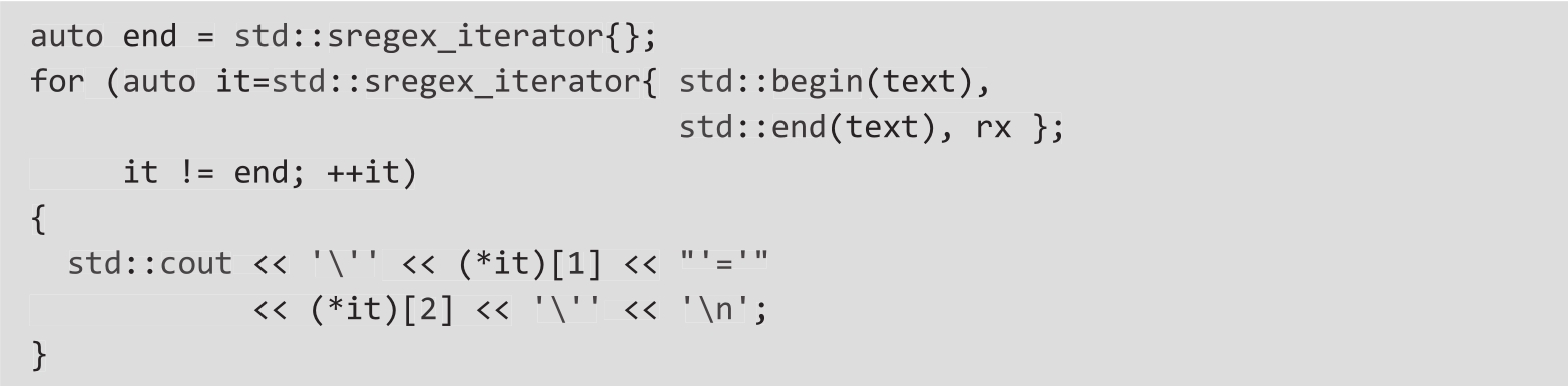 ❍ 要查找正则表达式匹配的所有文本,可以使用迭代器std::regex_iterator(示例2):