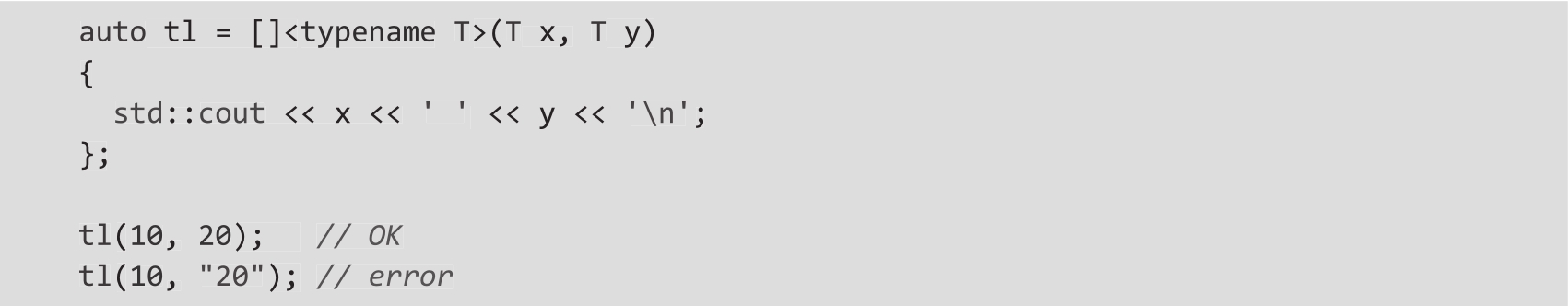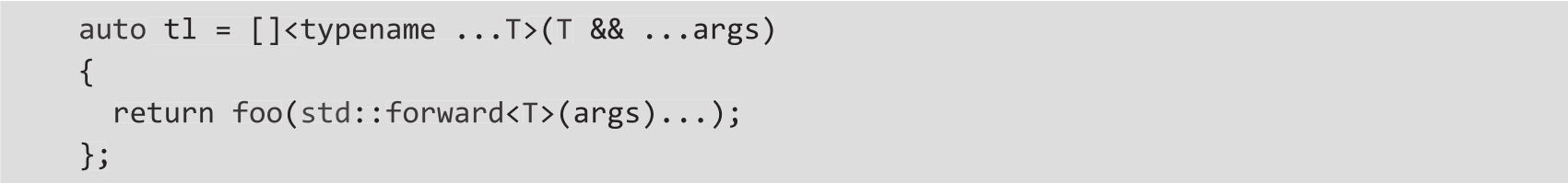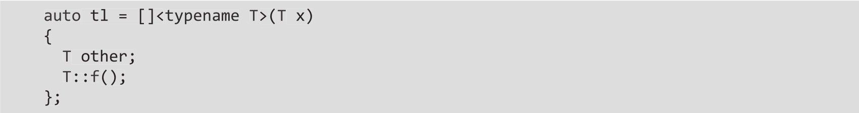 ❍ 通过在捕获子句之后的尖括号中使用模板参数列表(例如<template T>)。