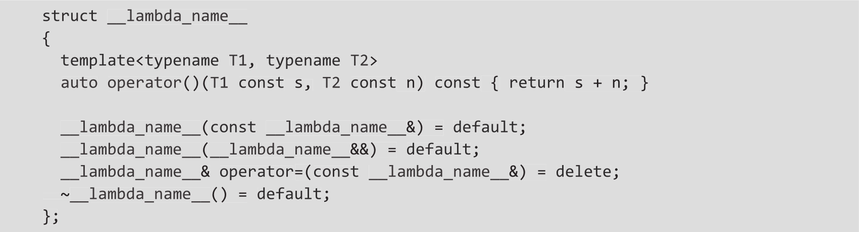 虽然泛型lambda在调用它们的地方可以匿名定义,但这并没有实际的意义,因为泛型lambda(正如我们前面提到的,泛型lambda是lambda表达式模板)的目的是能够被重用,如3.3.2节的示例所示。