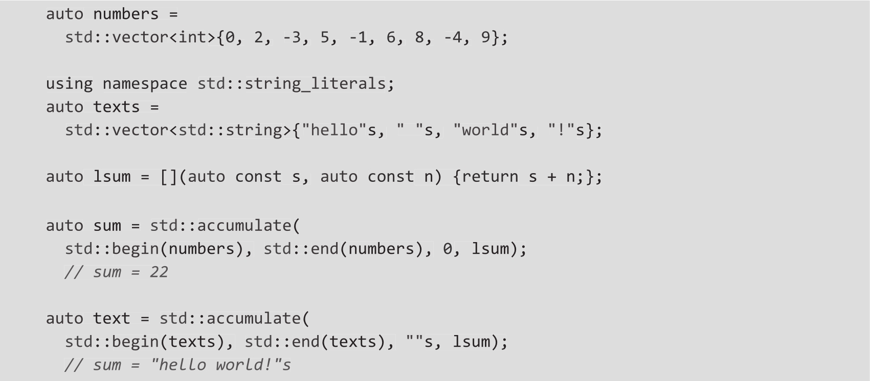 以下示例展示了一个与std::accumulate()算法一起使用的泛型lambda,首先用于一个整数vector,然后用于字符串vector: