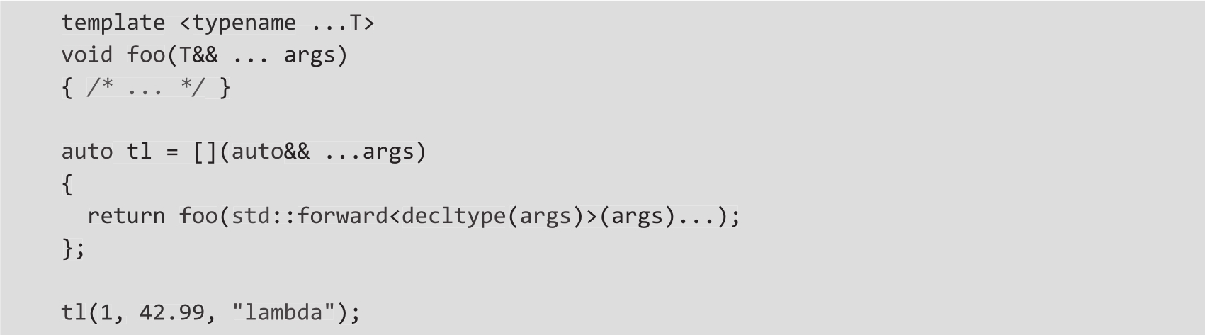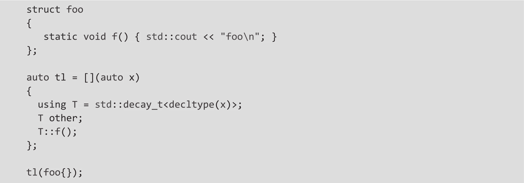 此解决方案需要使用std::decay_t和decltype。然而在C++20中,同样的lambda可以写成如下形式: